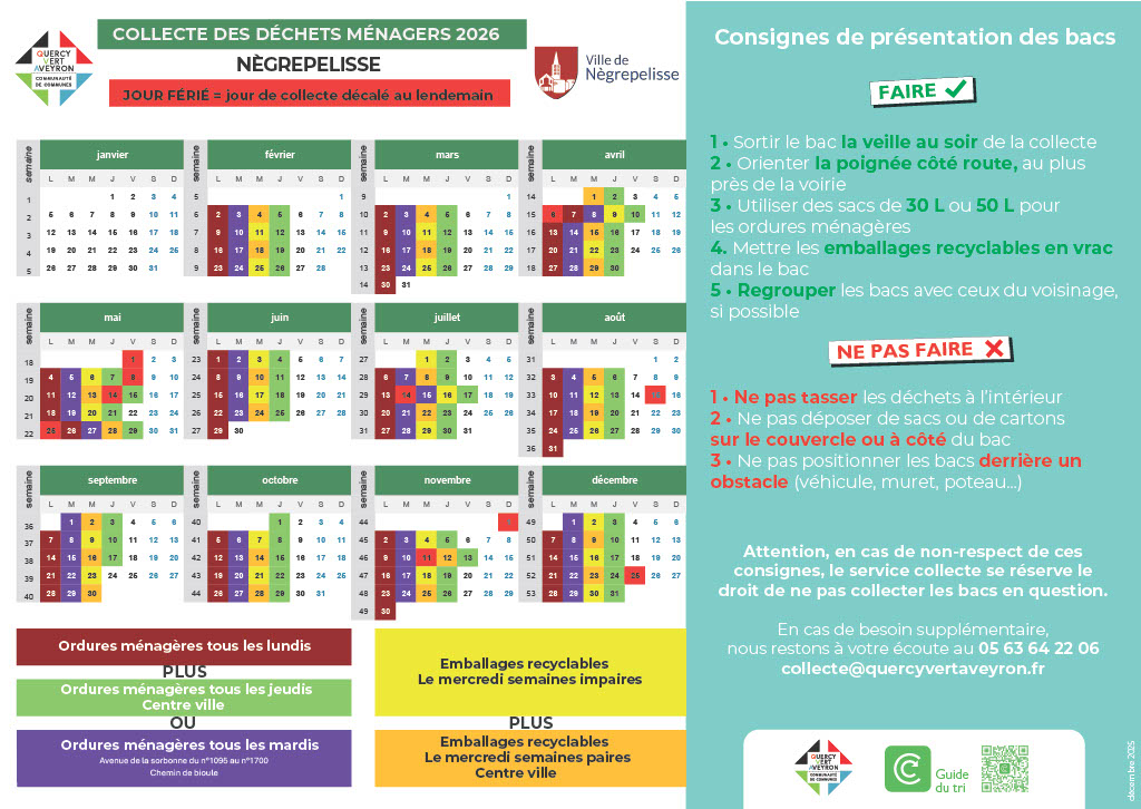 A compter du lundi 2 février 2026, la Communauté de Communes Quercy Vert-Aveyron met en œuvre une nouvelle organisation de la collecte des déchets sur l’ensemble de son territoire. En charge de la collecte des déchets à l’échelle de son territoire, la Communauté de Communes Quercy Vert-Aveyron change les jours de collecte sur l’ensemble des douze communes. Ces changements concernent aussi bien les collectes d’ordures ménagères que d’emballages recyclables. La Communauté de Communes invite les habitants à prendre connaissance des nouveaux jours de collecte sur le site internet de la ville : www.ville-negrepelisse.fr ou www.quercyvertaveyron.fr et à adapter la présentation de leurs bacs en conséquence.