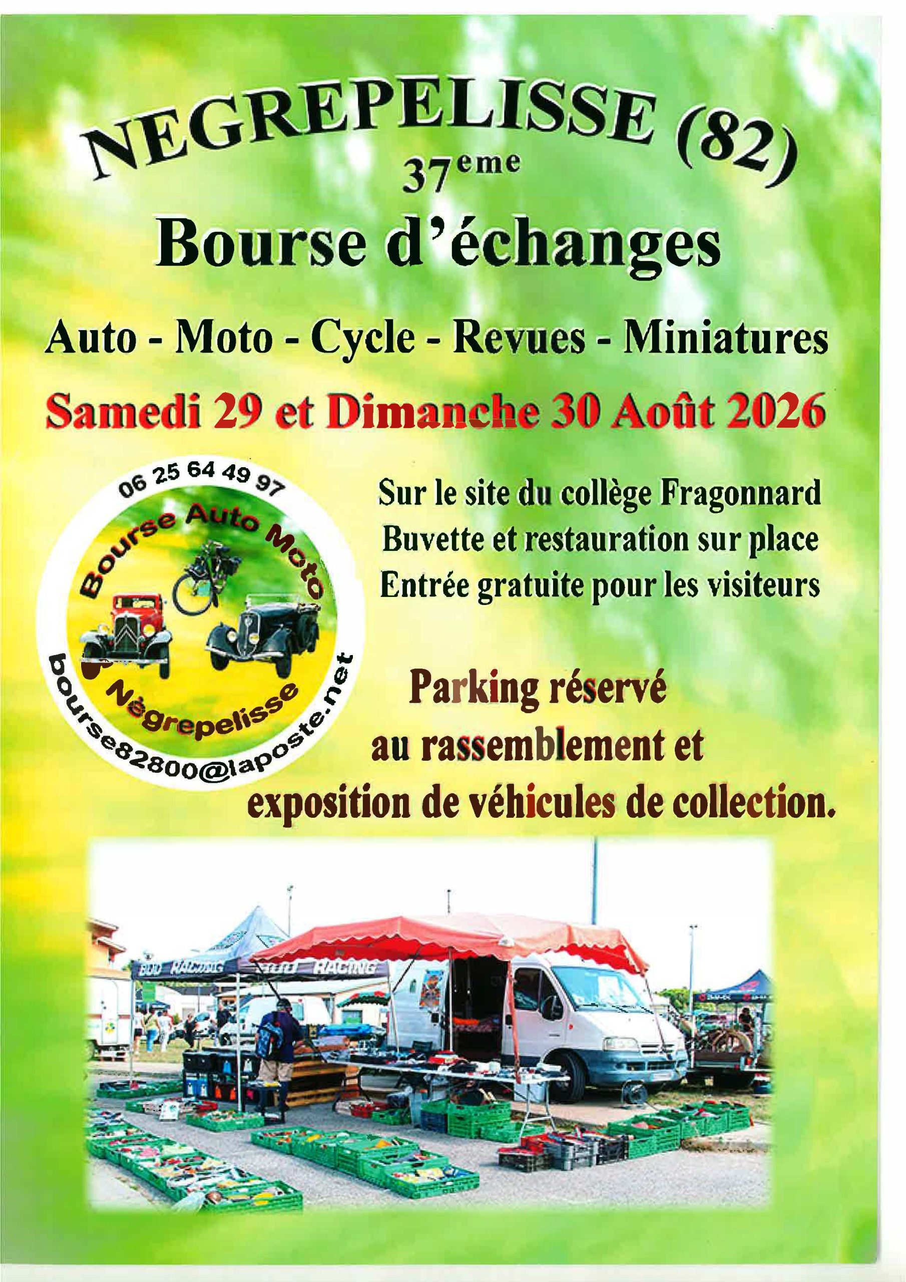 - Contact et renseignements : pour plus d’informations ou pour les exposants, vous pouvez contacter l’organisation au 06 25 64 49 97 ou par email à bourse82800@laposte.net.