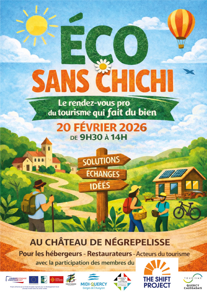 Le vendredi 20 février 2026, de 9h30 à 14h, le Château de Nègrepelisse accueillera « Éco sans Chichi », le rendez-vous professionnel du tourisme durable. Cette rencontre, placée sous le signe des solutions, des échanges et des idées, est spécifiquement dédiée aux hébergeurs, restaurateurs et acteurs du tourisme du territoire. L’événement bénéficiera de la participation des membres du « The Shift Project » et est organisé en collaboration avec plusieurs partenaires locaux dont la Communauté de communes Quercy Vert-Aveyron et l’office de tourisme Quercy Caussadais.