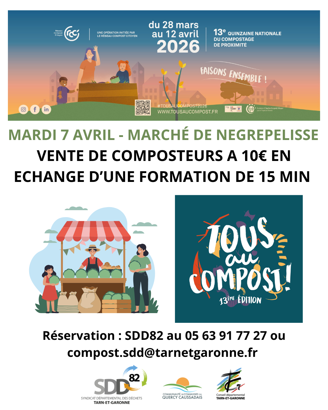 Dans le cadre de la 13ème Quinzaine nationale du compostage de proximité (du 28 mars au 12 avril 2026), la ville de Nègrepelisse et le SDD82 vous invitent à passer à l’action pour réduire vos déchets ménagers. Le mardi 7 avril 2026, profitez de votre passage au marché pour adopter de bons réflexes et repartir avec votre propre composteur à prix réduit !