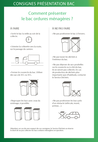 Les poubelles d’ordures ménagères doivent respecter les normes de sécurité en vigueur. De ce fait, seuls les bacs normalisés sont collectés : le bac grenat pour les ordures ménagères et le bac jaune pour les déchets recyclables. Pensez à sortir vos bacs la veille au soir des collectes et n’oubliez pas de les rentrer une fois la collecte effectuée.